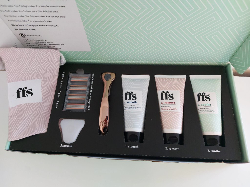Introducing the ultimate shaving experience, everything you need for silky smooth skin neatly packaged in one box. FFS 3 step shave systems contain ingredients known to fight blocked pores, reduce irritation and hydrate your skin. Weighted reusable handle and long-lasting blades ensure effortless glide for the smoothest shave.